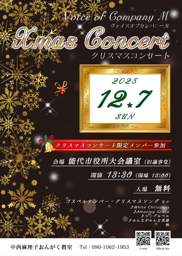 クリスマスコンサートのご案内 2025年12月1日 最終更新日時 : 2025年12月1日 mariko 今年もクリスマスコンサート限定メンバーさんの参加をいただき、たっぷり歌います。コンサート恒例のお客様によるコールアンドレスポンスコーナーやお帰りの際のミニミニお土産もおたのしみに❣こころよりお待ちしております。 FacebookXCopy